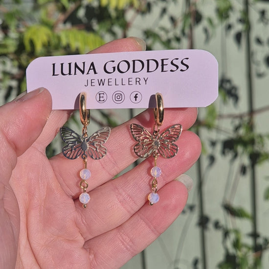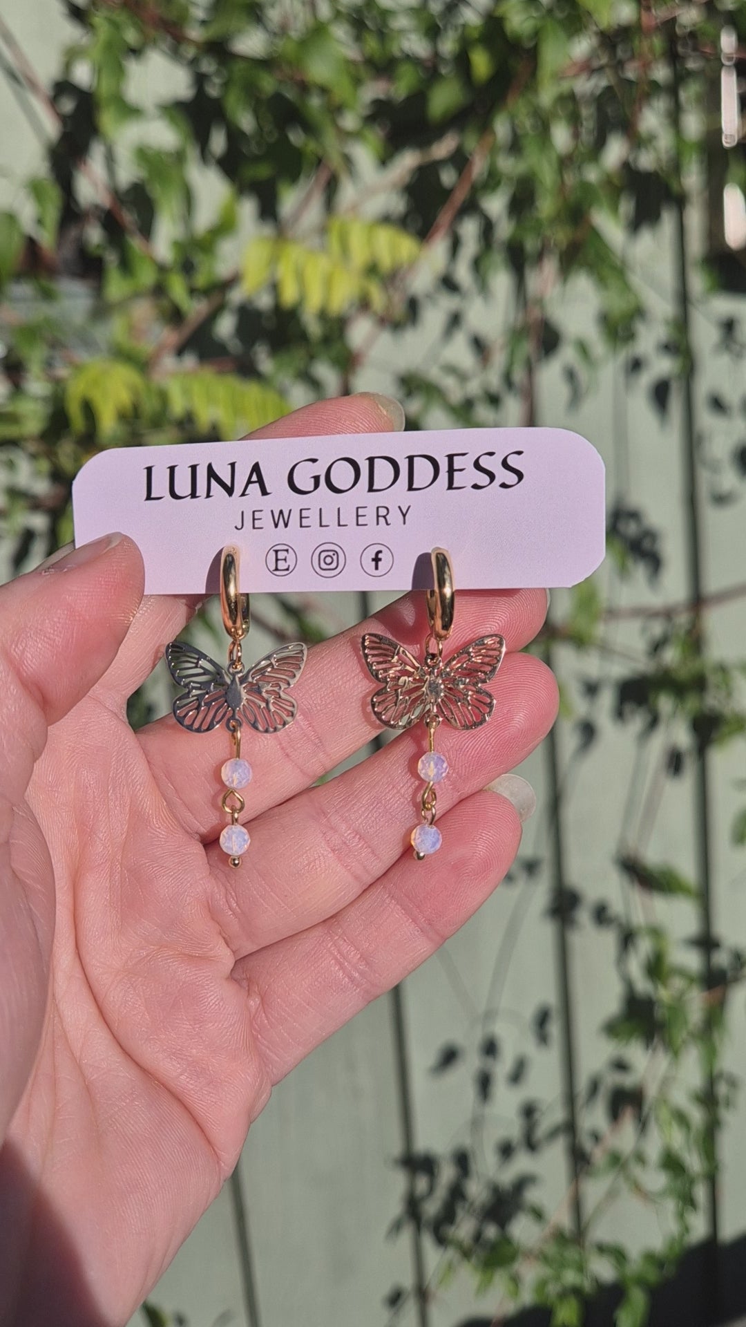 Soft witchy fairy energy in earring form. These gold stainless steel huggies feature a dainty butterfly charm paired with two shimmering opalite beads - dreamy, feminine and perfect for celestial girlies who love magical detailing.