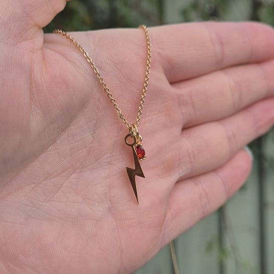 A sleek, minimal gold plated chain decorated with a sparkly orange Cubic Zirconia charm and a bold lightning bolt. A subtle nod to showgirl glamour - witchy, celestial and perfect for layering.