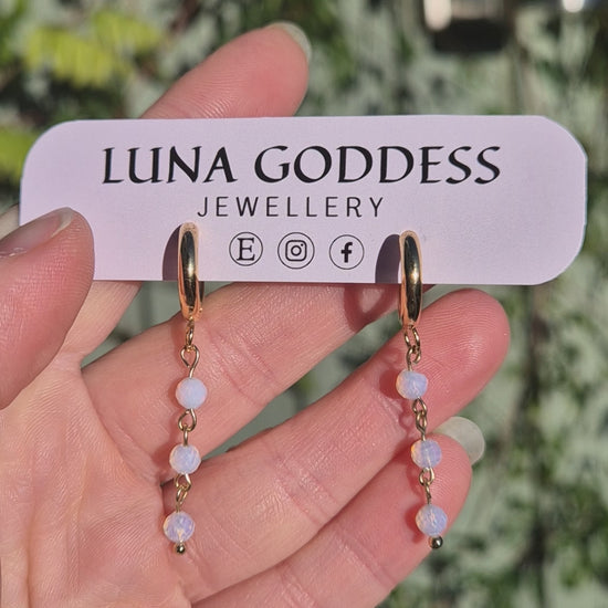 These celestial gold huggies feature a delicate chain with three shimmering opalite beads. Elegant, witchy and perfect for adding soft cosmic energy to your everyday look.