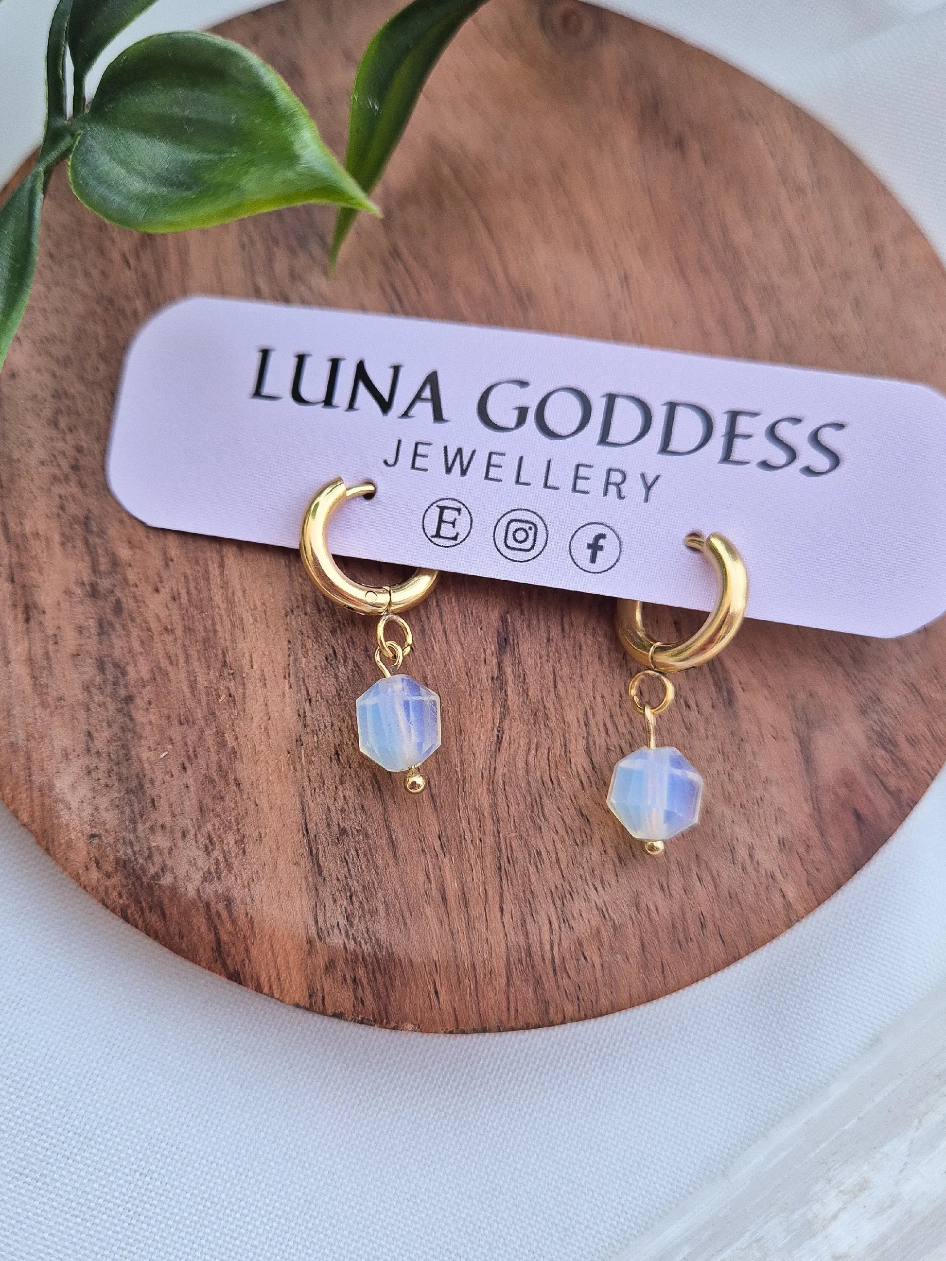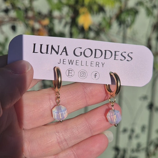 Simple, glowing and perfect for everyday witchy styling. These gold stainless steel huggies hold a single soft opalite bead - a minimal celestial staple that goes with absolutely everything.