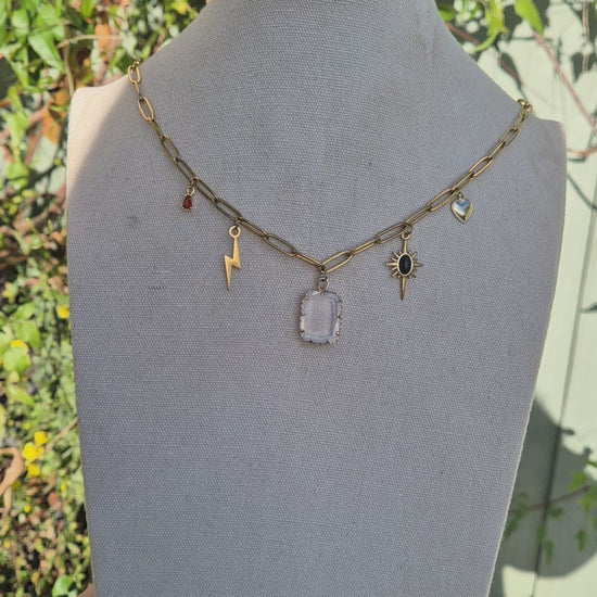 Featuring a glowing Opalite pendant, an onyx star, lightning bolt, orange Cubic Zirconia charm, and a tiny heart - all layered on a stainless steel paperclip chain.