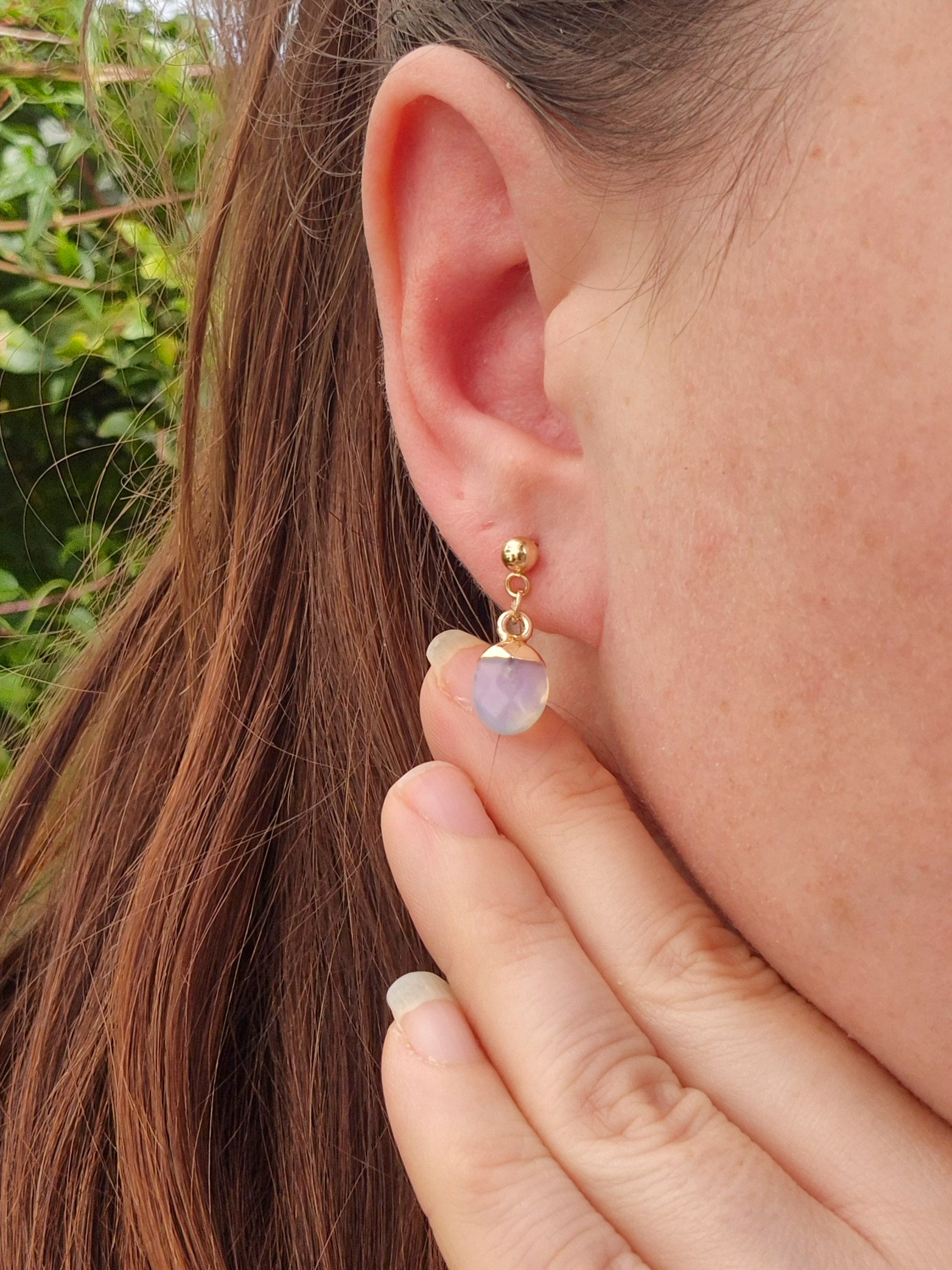 Electroplated Opalite earrings made with 18k Gold-Plated Stainless-Steel. Stainless steel is the perfect option for those who have sensitive ears and are looking for jewellery which will last, is waterproof and not tarnish. Choose between Huggies, Hoops, Ear wire or Ball studs Hardware.